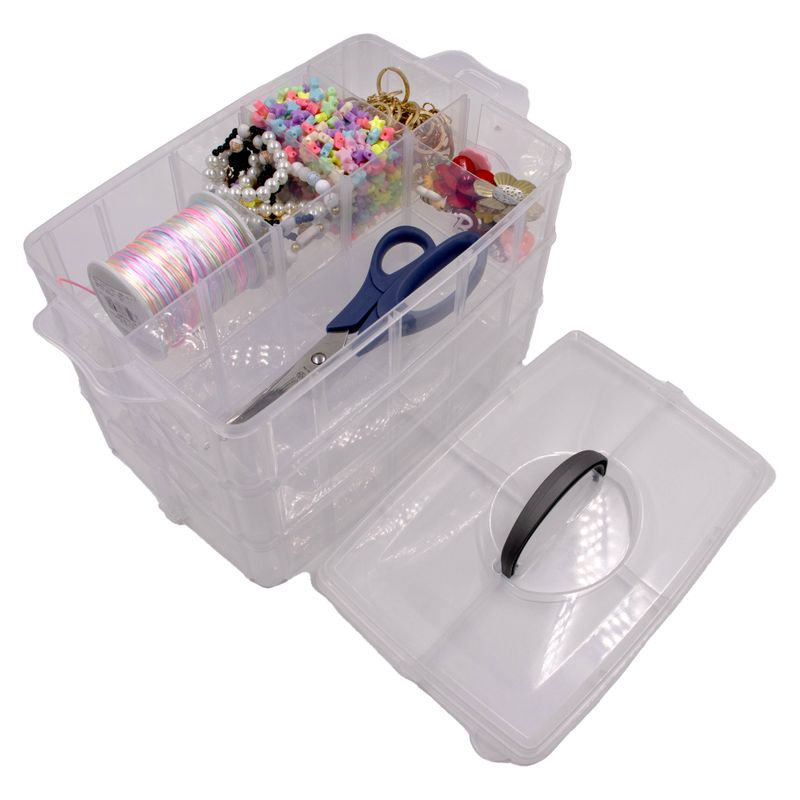 Com o design de maleta, a caixa organizadora é feita toda em plástico trazendo resistência e durabilidade para o produto. Possui 3 compartimentos com 10 divisórias cada um que a tornam ideal para armazenar alicates, tesouras, colas, pistola de cola quente, miçangas, bijuterias e até mesmo criar kits para artesanatos em geral. Além disso, a caixa vem com uma novidade inovadora que são as divisórias removíveis, trazendo a liberdade de deixar a divisória no tamanho ideal para sua necessidade.
