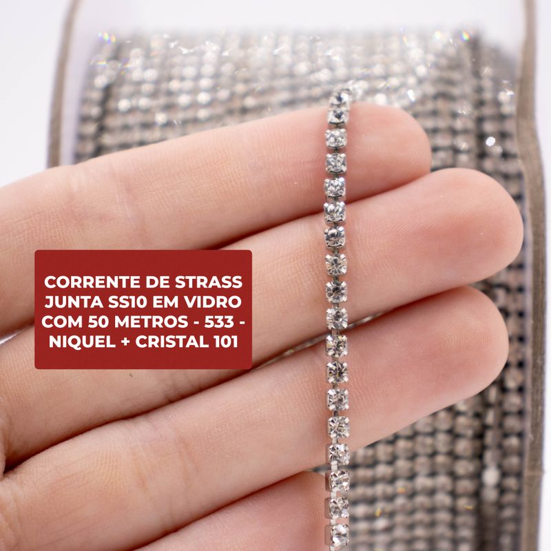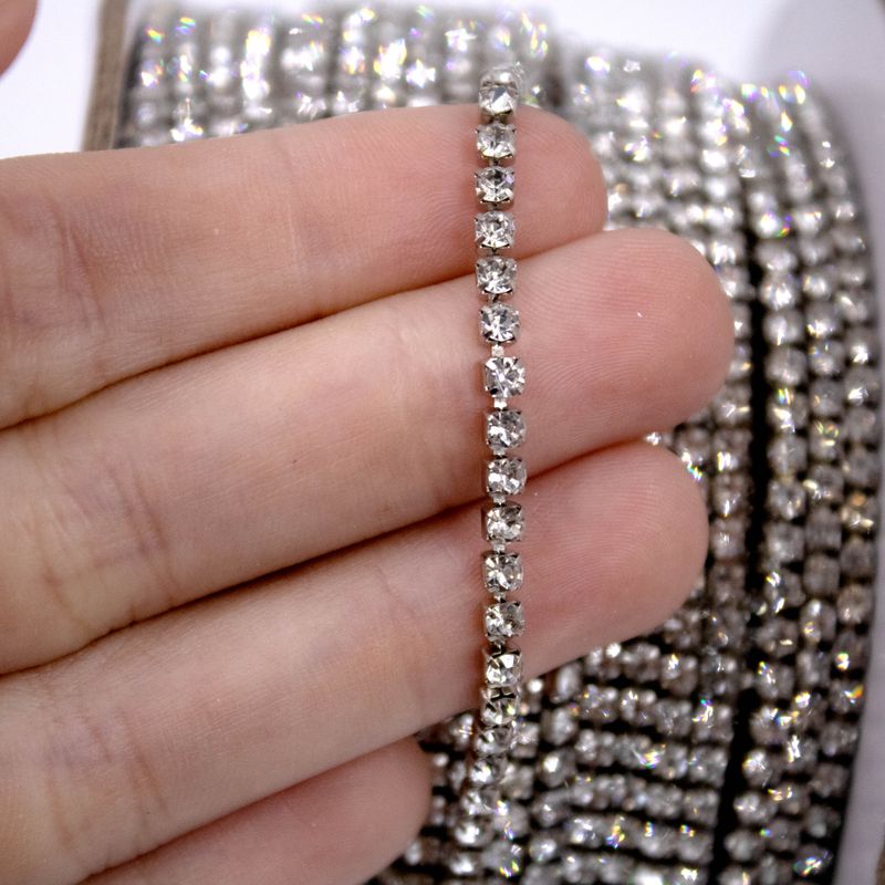 Produzida em vidro, a corrente de STRASS possui um brilho único proporcionando um acabamento luxuoso em suas peças. Com ela é possível criar e realizar acabamento em peças de roupas, chinelos, óculos, bijuterias e artesanatos em geral. Sua base é produzida em latão para garantir a qualidade do produto e evitar que as pedras se soltem.