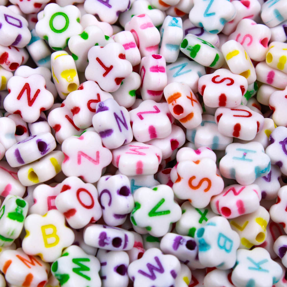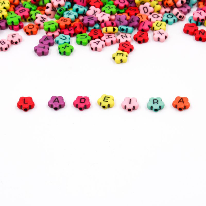 Produzido em plástico, o entremeio flor é ideal para confecção de bijuterias, chaveiros, lembrancinhas e artesanatos em geral. O pacote contém todas as letras do alfabeto.