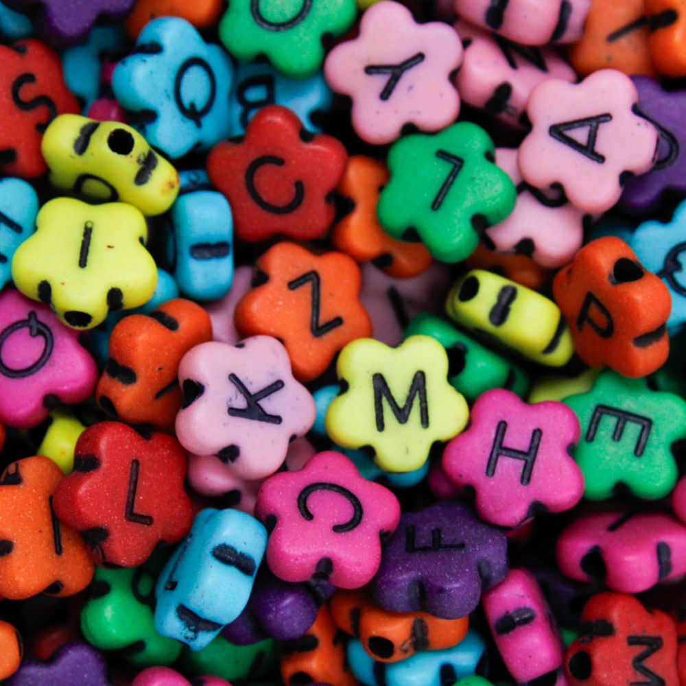 Produzido em plástico, o entremeio flor é ideal para confecção de bijuterias, chaveiros, lembrancinhas e muito mais. O pacote contém todas as letras do alfabeto.