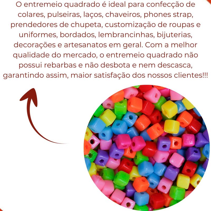 Produzido em plástico,o entremeio quadrado é ideal para confecção de bijuterias, chaveiros, lembrancinhas e artesanatos em geral.
