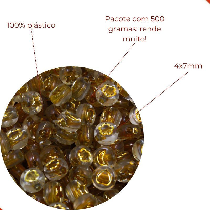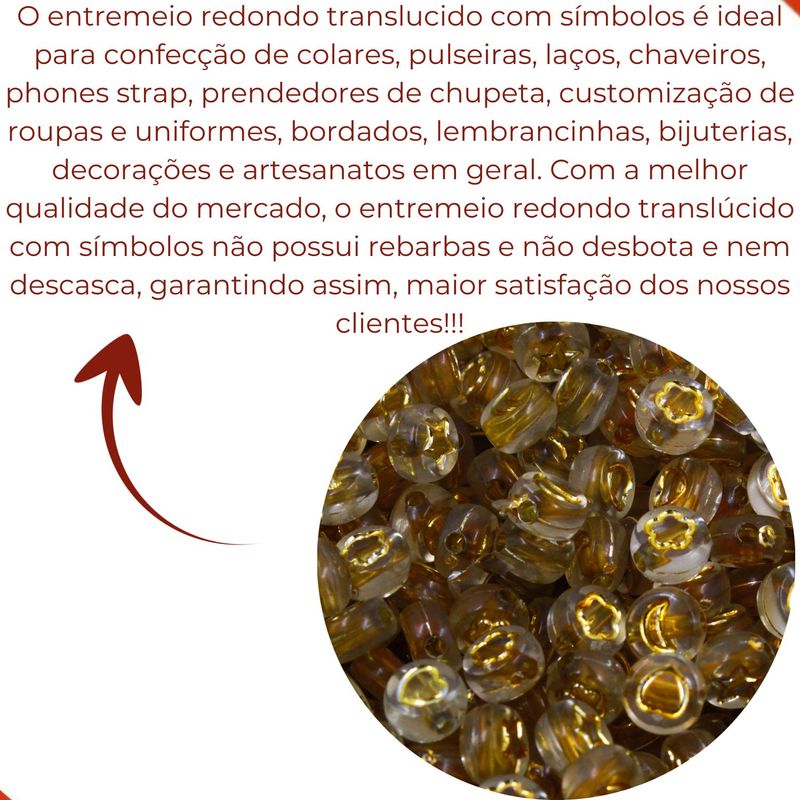 Produzido em plástico, o entremeio redondo translucido com simbolos, é ideal para confecção de bijuterias, chaveiros, lembrancinhas e muito mais...