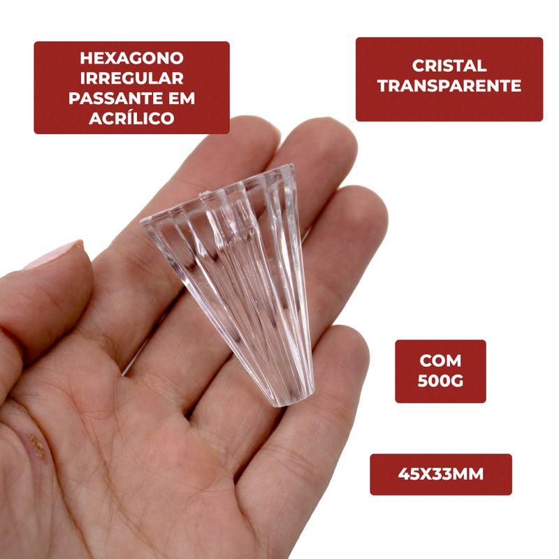 Com seu formato geométrico diferenciado, este hexágono irregular traz um toque contemporâneo e estilizado às suas criações. Produzido em acrílico de alta qualidade, ele é resistente e possui um brilho sutil, perfeito para confecção de bijuterias, acessórios, decoração e outros trabalhos manuais. Versátil e fácil de combinar, o Hexágono Irregular Passante em Acrílico é a escolha ideal para quem busca um acabamento sofisticado e original.