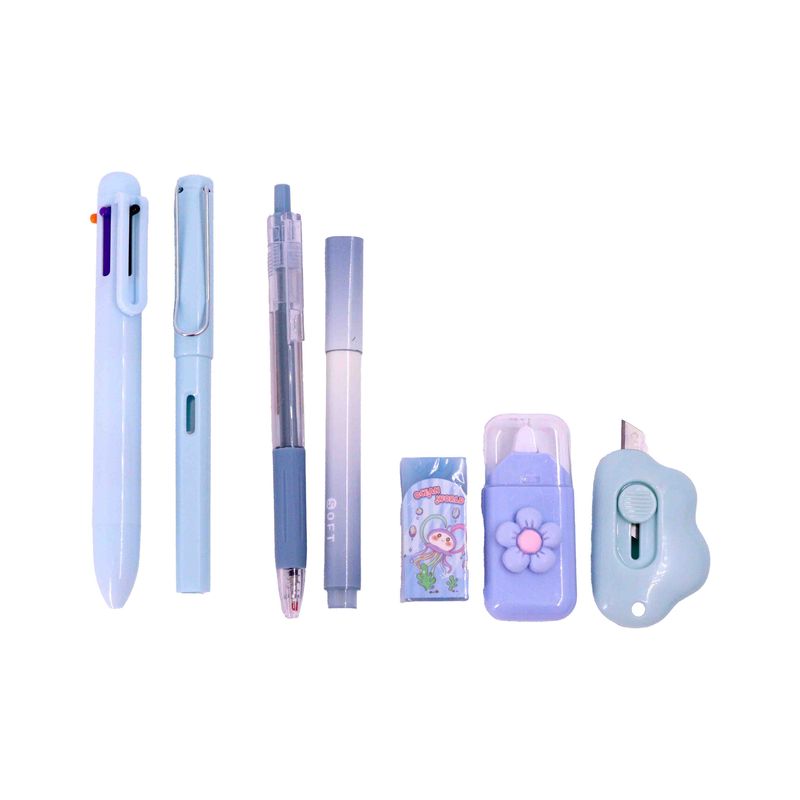 Conteúdo: 01 Borracha | 01 Marca Texto | 01 Estilete | 01 Fita Corretiva | 01 Caneta de Gel Ponta Fina | 01 Caneta 06 Cores | 01 Lápis Mágico