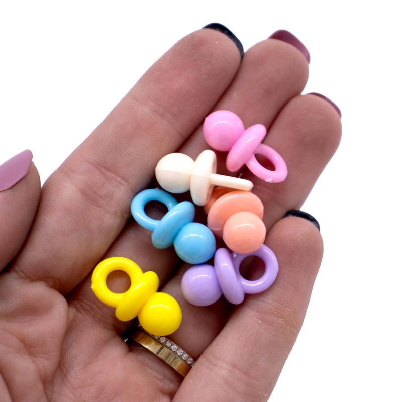 Produzido em acrílico, o pingente chupeta é ideal para confecção de lustres infantis, lembrancinhas, chaveiros e artesanatos em geral.