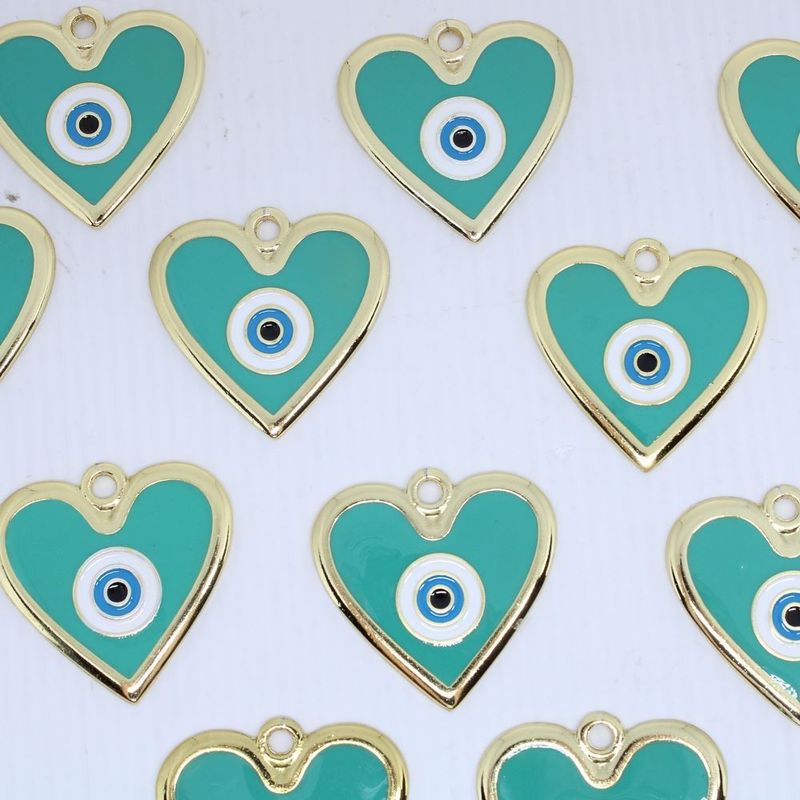 Produzido em fundição zamak, o pingente coração olho grego é ideal para confecção de colares, correntes, pulseiras, chaveiros e muito mais