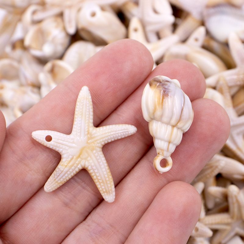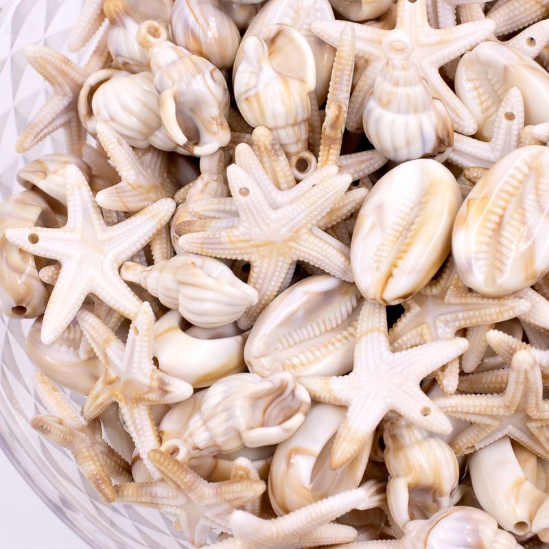 Pingente com formato de estrela e búzios do mar em acrílico, leve e resistente. O design traz uma inspiração praiana, combinando o brilho translúcido do material com o charme natural dos elementos do mar. Ideal para montar colares, pulseiras e acessórios com estilo tropical e descontraído