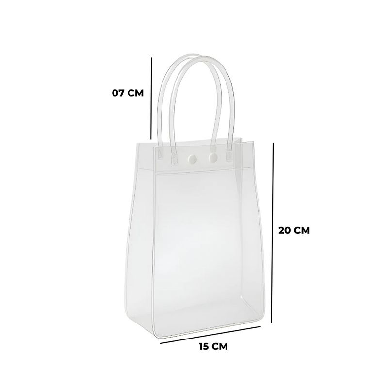 Prática e elegante, a sacola transparente em plástico é ideal para quem busca funcionalidade com um toque moderno. Produzida em material plástico resistente, permite visualizar o conteúdo com facilidade, facilitando a organização e dando um charme especial à apresentação de produtos ou lembrancinhas.Perfeita para lojas, eventos, brindes, festas ou uso pessoal, a sacola conta com alças reforçadas para transporte seguro e confortável. Destaque seus produtos com uma embalagem diferenciada e reutilizável!