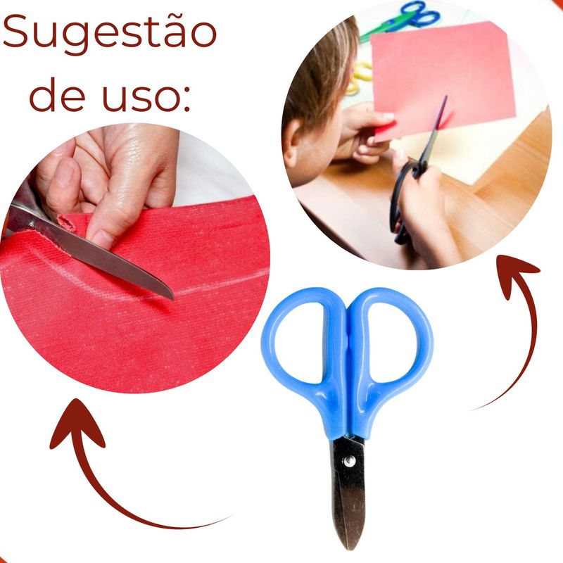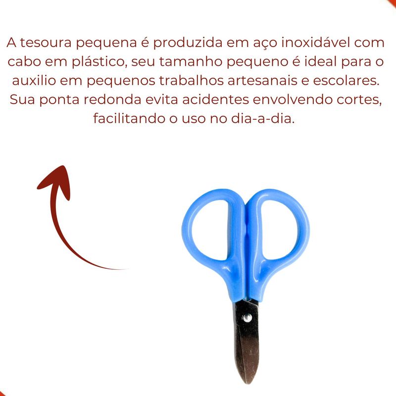 A tesoura pequena é produzida em aço inoxidável com cabo em plástico, seu tamanho pequeno é ideal para o auxilio em pequenos trabalhos artesanais e escolares. Sua ponta redonda evita acidentes envolvendo cortes, facilitando o uso no dia-a-dia.